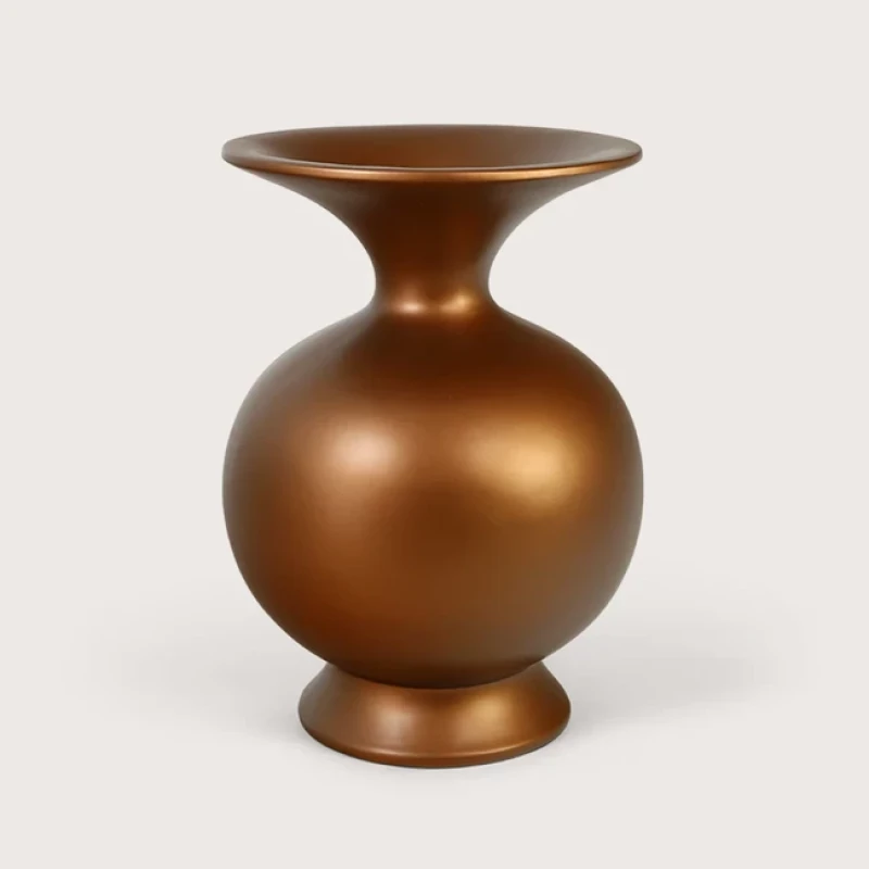 Unikátní tvar „belly“ (bříško) dodává váze jemnou plasticitu a osobitost. Povrch v měděném odstínu působí luxusně a přitom přirozeně – krásně vynikne v kombinaci s tmavým dřevem, mramorem i betonem.