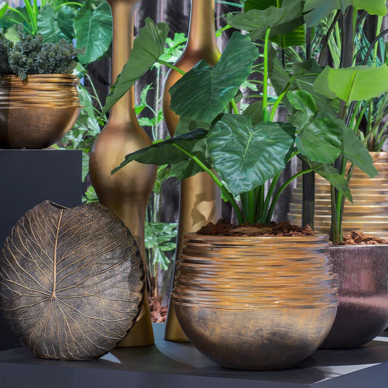Zlatý povrch dodává váze luxusní charakter, který se snadno kombinuje s moderním, minimalistickým i glamour stylem. Díky své odolnosti vůči povětrnostním vlivům je vhodná do obývacích pokojů, vstupních hal, kanceláří, hotelových prostor i na terasy.