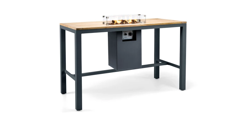 Tento barový stůl s hliníkovým rámem a teakovou deskou má elegantní, moderní vzhled, a proto se hodí do různých typů zahrad a teras. Stůl je vybaven vestavěným hořákem pro vytvoření atmosféry a tepla. Ideální k stání nebo posezení s vaší společností.