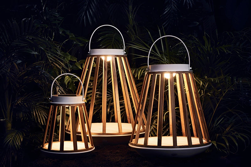 Hliníková konstrukce zajišťuje lampě spolehlivý a odolný rám, jelikož se hliník vyznačuje vynikající odolností vůči povětrnostním vlivům. Teaková "kostra" je také mimořádně odolná a pevná. Teak si zachovává dlouhou životnost a časem z přirozené barvy zbledne na jemnou šedou, což mu dodává šarm a dotváří přirozený charakter teakového dřeva.