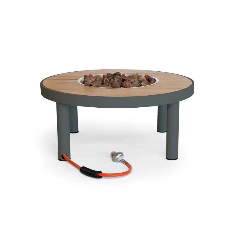 Eegantní kulatý plynový krbový stůl s prémiovou deskou z teak dřeva a moderním designem, který se hodí do každého venkovního prostoru.