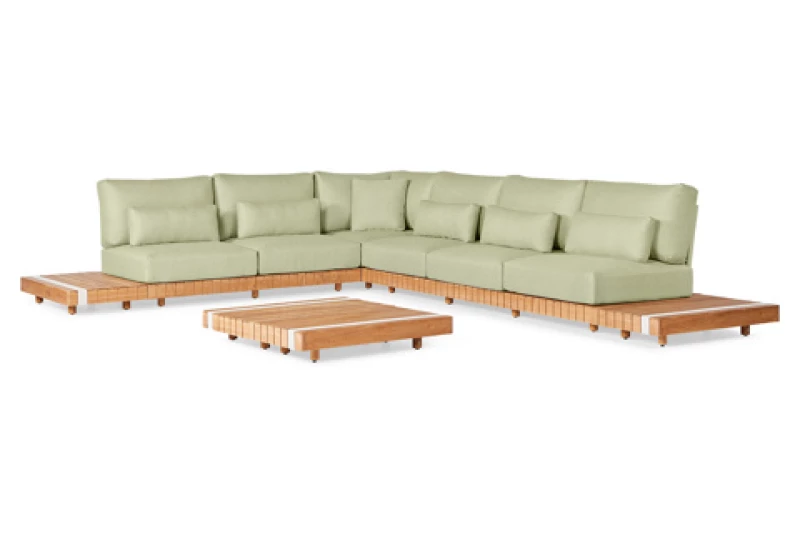 Sedací souprava je navržena v pevném rohovém uspořádání bez příručních stolků, které nabízí maximální využití prostoru. Součástí jsou čtyři elegantní teakové příruční stolky, které doplňují funkčnost i estetiku celé sestavy.
