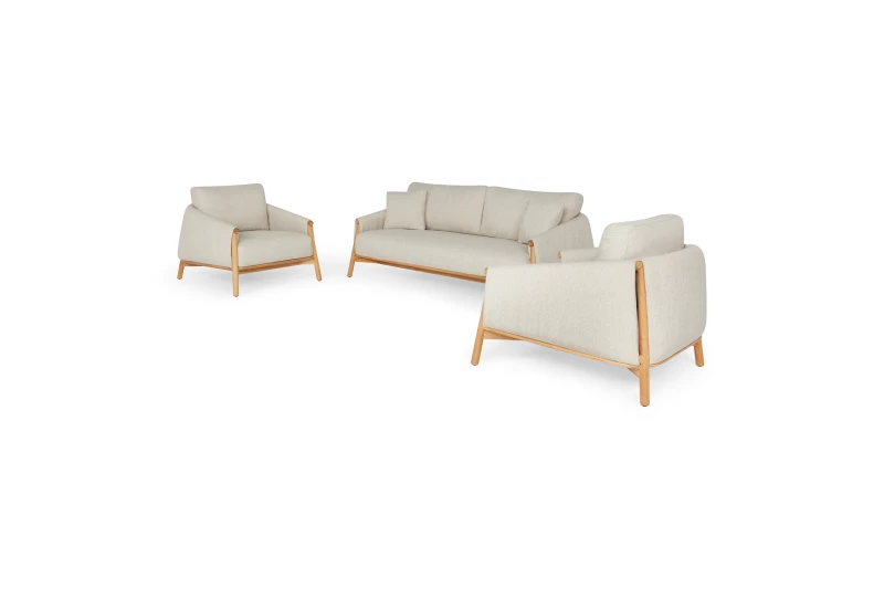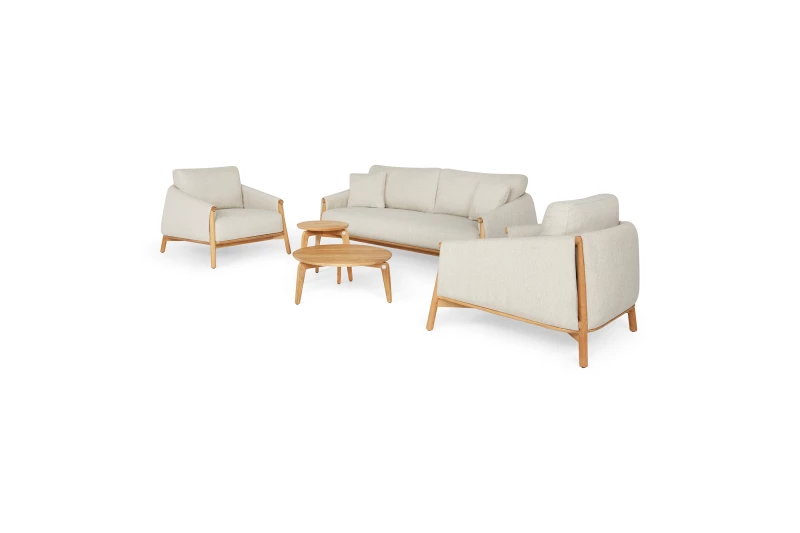 Teak je nejen mimořádně pevný, ale i esteticky krásný – časem získává teplý šedý odstín, který podtrhuje jeho přírodní charakter a jedinečnost. Elegantní tvarování rámu doplňuje částečné obepnutí látkou, které ponechává viditelné teplé tóny dřeva a polštáři z exkluzivní, měkké látky Seashell bouclé nebo Natural gravel.