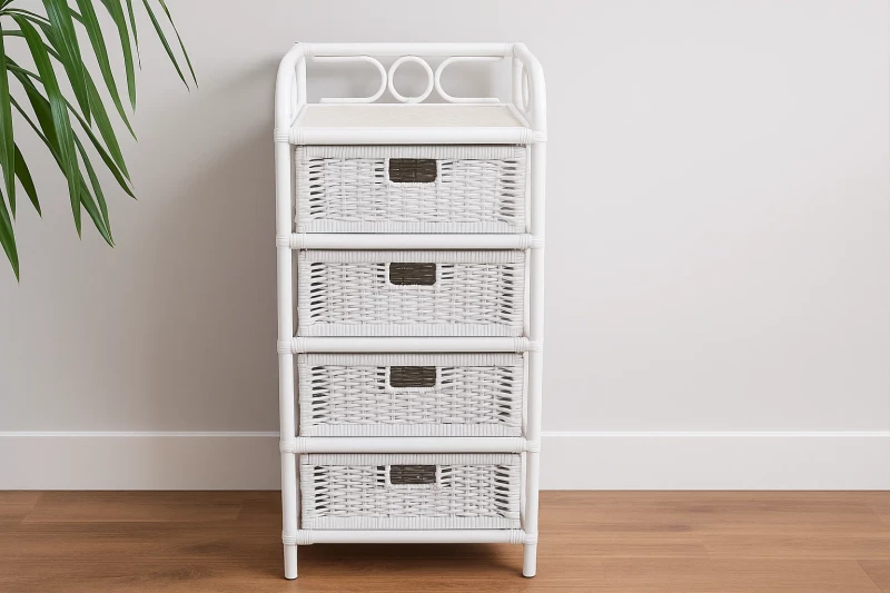 Bílá ratanová komoda se čtyřmi zásuvkami je lehký a odolný úložný nábytek z přírodního materiálu. Díky ratanové kůře dobře snáší vzdušnou vlhkost, takže ji lze využít i v koupelnách nebo na verandách. Poskytuje dostatek prostoru pro prádlo, oblečení nebo koupelnový textil a díky bílé povrchové úpravě přináší svěží, čistý a nadčasový vzhled.