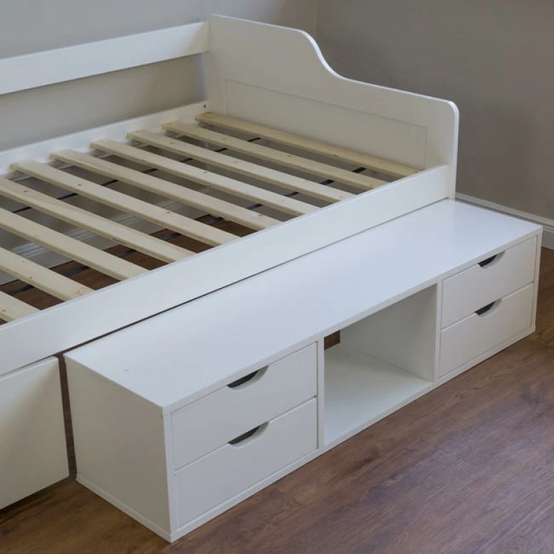 Dětská postel 90×200 bílá se zásuvkami je kombinuje praktický úložný prostor, masivní borovicovou konstrukci a moderní bílé čelo. Ideální pro malé pokoje, kde je potřeba místo pro hračky a prádlo. Úzký minimalistický rám se hodí do moderních, skandi i tradičních interiérů.
