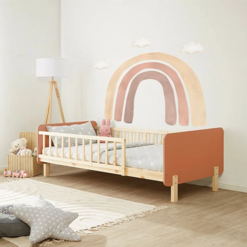Stylová růžová dětská postel 90×200 cm vytvoří v pokoji bezpečné a útulné místo pro spánek i odpočinek. Kombinuje teplou starorůžovou s přírodním borovicovým dřevem, díky čemuž působí moderně, jemně a snadno se sladí s ostatním nábytkem.