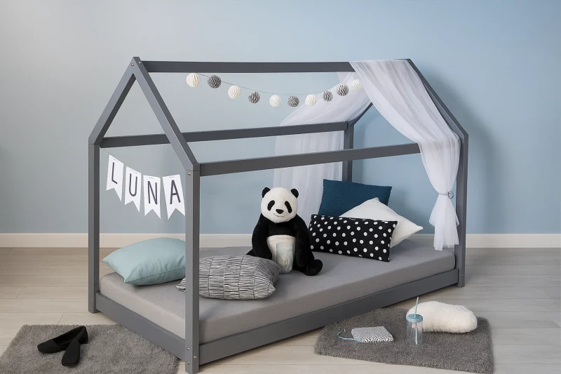 Dětská postýlka domeček šedá 90×200 – prostor pro spánek, hraní i fantazii