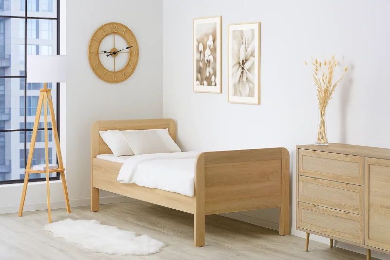 Jednolůžková postel ADONIA 90×200 v přírodním dubovém dekoru nabízí zvýšenou výšku pro snadné vstávání, nastavitelnou hloubku uložení roštu a pevnou konstrukci. Ideální pro seniory, děti od 3 let i hosty.