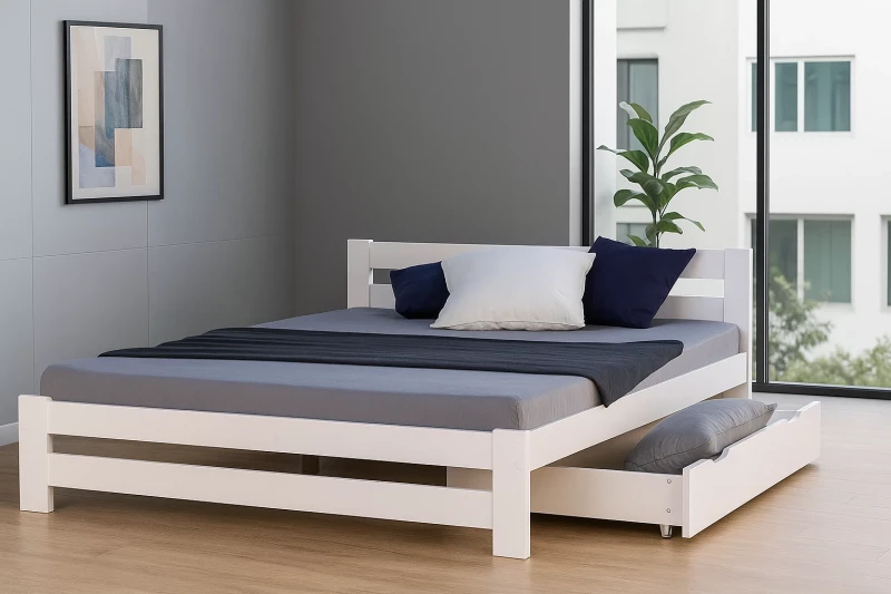 Manželská postel 140×200 bílá borovice – nadčasový design s praktickým úložným prostorem