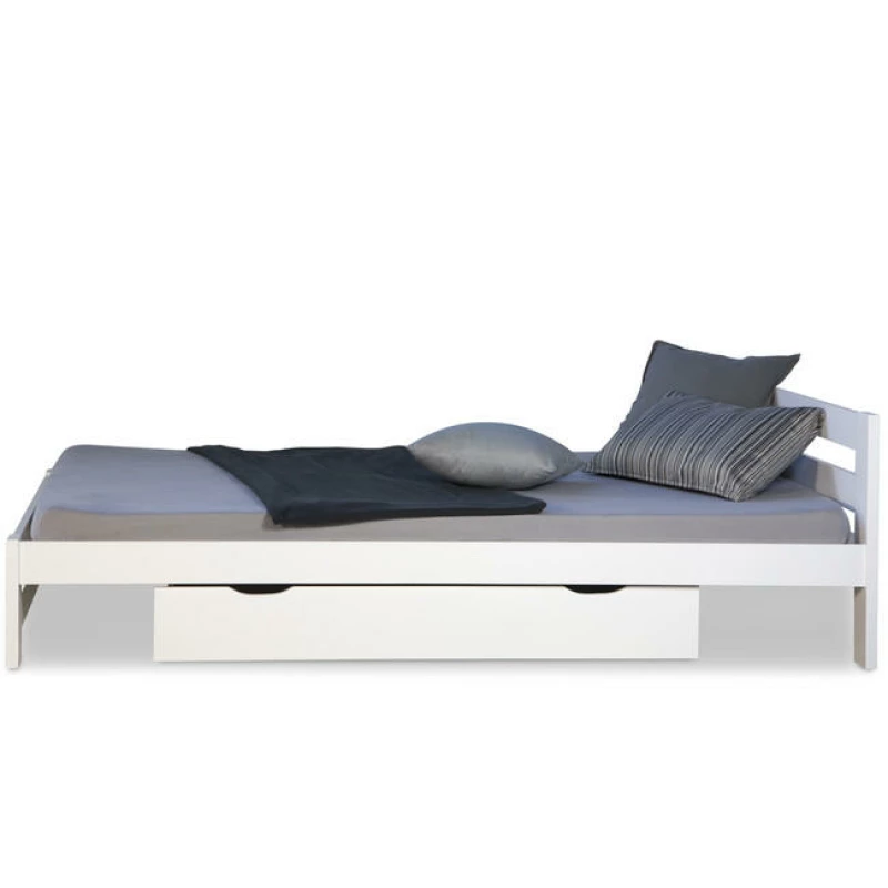 Dřevěná manželská postel 140×200 z bílé borovice s vysokým čelem a velkou úložnou zásuvkou. Stabilní konstrukce, rošt v ceně, zaoblené hrany, praktický úložný prostor s výsunem z obou stran.