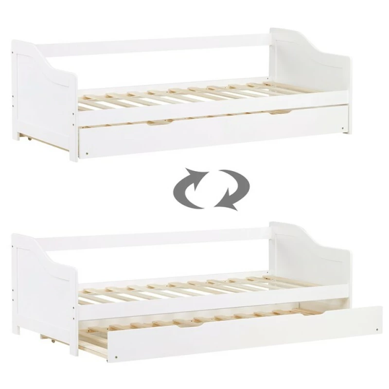 Bílá postel s přistýlkou CAMILA 90×200 z masivní borovice. Výsuvná plocha pro hosty, 2 lamelové rošty v ceně, zaoblené hrany a stabilní konstrukce. Ideální do dětských pokojů, pokojů pro hosty i menších bytů.