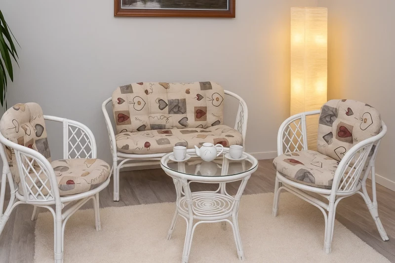 Souprava zahrnuje dvoumístnou pohovku, dvě pohodlná křesla a ratanový stolek se skleněnou deskou. Součástí je také kompletní sada kvalitních českých polstrů, známých pro svou měkkost a tvarovou stálost. Pevné šroubované spoje konstrukce zajišťují stabilitu a dlouhou životnost nábytku.
