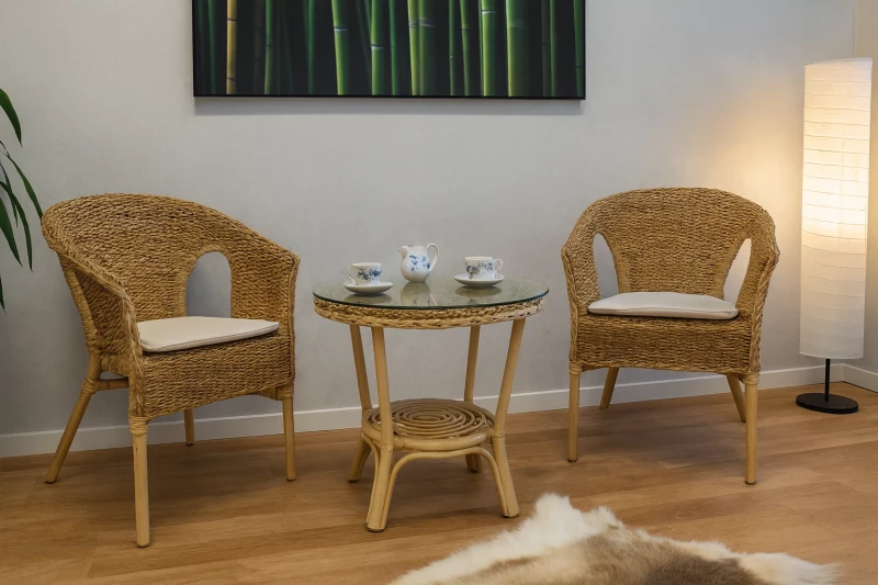 Souprava je ideální do interiéru, zimních zahrad a krytých teras. Výplet z banánového listu dodává nábytku výjimečnost a řadí jej mezi luxusní přírodní sedací soupravy.