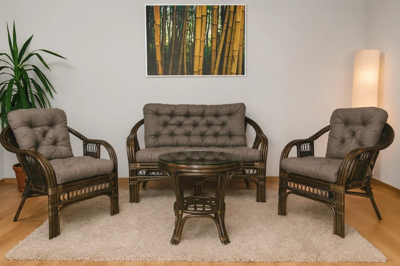 Ratanová sedací souprava Rio de Janeiro patří mezi klasiku z přírodního ratanu, která vyniká vysokou pevností, kvalitním zpracováním a nadčasovým designem. Konstrukce je vyrobena z masivních ratanových tyčí, přičemž hlavní nosné části jsou vedeny v trojitém provedení, což výrazně zvyšuje stabilitu i životnost nábytku.