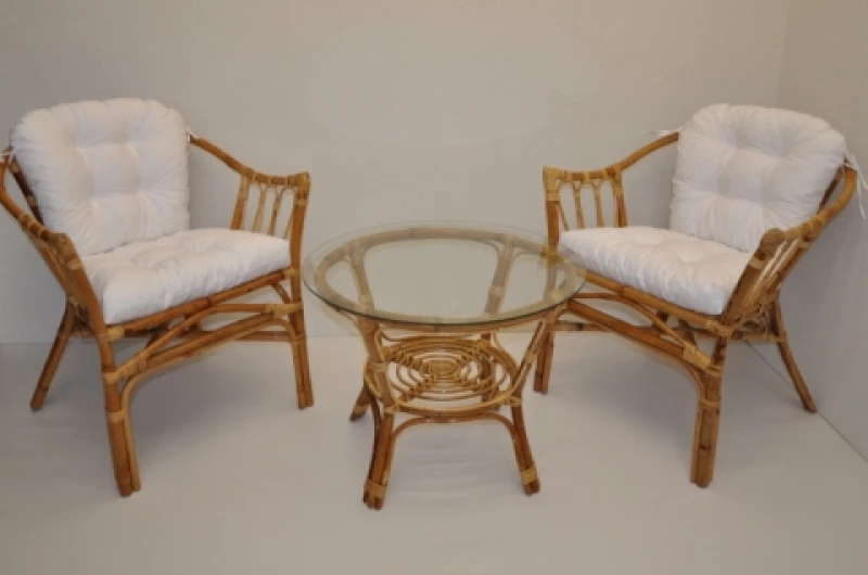Ratanová souprava Subaliu z přírodního ratanu semambo. Obsahuje 2 křesla, stolek se sklem a české polstry s drceným molitanem. Nosnost křesla 115 kg, kvalitní provedení, přírodní design pro interiér i zimní zahrady.