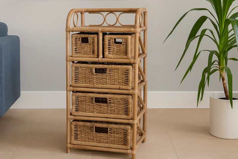 Prádelník je vyroben z kvalitního přírodního ratanu, který je lehký, odolný a výborně snáší i zvýšenou vlhkost, což z něj činí ideální řešení do koupelen či chodeb. Pět praktických zásuvek poskytuje dostatek úložného prostoru a horní část komody lze využít jako odkládací plochu pro dekorace, košíky nebo drobnosti.