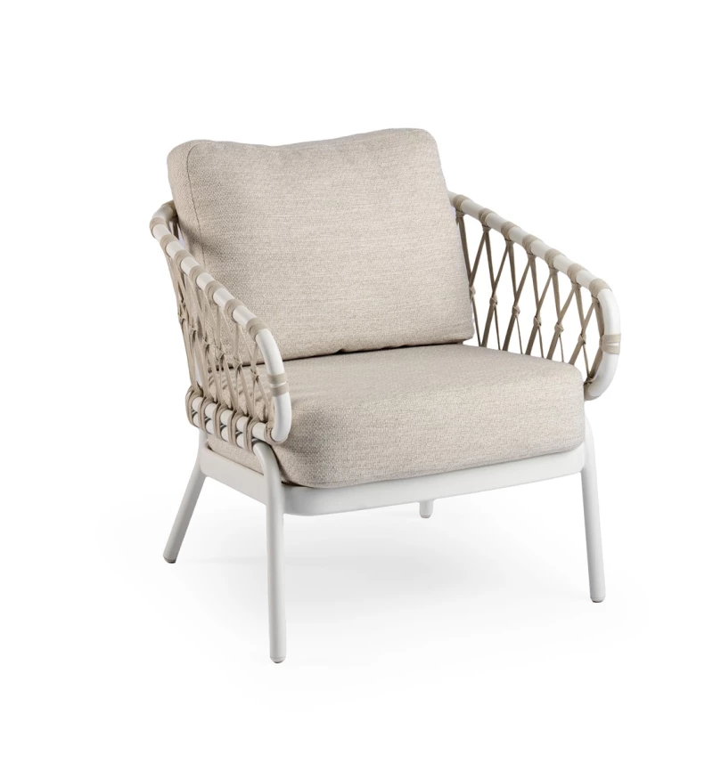 Nízká jídelní křesla Natal navazují na design stolu – jejich hliníková konstrukce je doplněna olefinovým lanem a polštáři z prémiové tkaniny Swiss Fabric, které zaručují maximální pohodlí a dlouhou životnost.