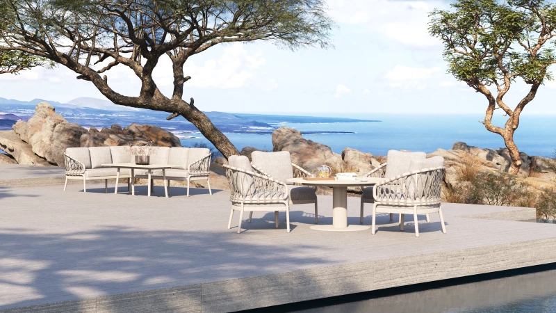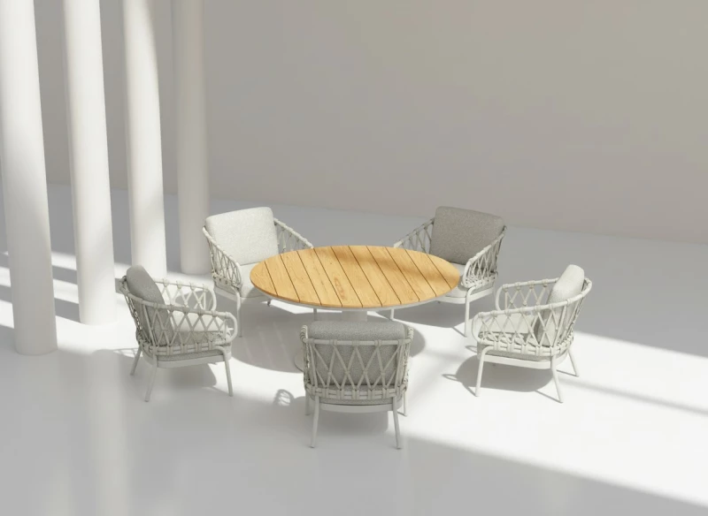Křeslo je vyrobeno z prvotřídního hliníku s práškovým nástřikem v krémově bílé barvě, který je lehký, odolný a zcela bezúdržbový. Otevřená zádová konstrukce a lanový výplet z olefinového lana s ručně pletenými diamantovými uzly dodávají křeslu vzdušnost a jemný estetický detail, který podtrhuje jeho sofistikovaný vzhled. Elegantní kombinace krémově bílé konstrukce a polštářů v odstínu Dove grey vytváří harmonický celek vhodný do moderních i přírodních exteriérů.