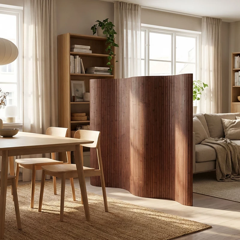 Jeho speciální konstrukce umožňuje umístění v zakřiveném tvaru, což zajišťuje nejen stabilitu, ale také dekorativní, jemnou siluetu v místnosti. Díky tomu lze snadno vizuálně oddělit oblasti, vytvořit útulná útočiště nebo stylově rozdělit otevřené prostory. Navzdory své robustní konstrukci zůstává dělící stěna flexibilní a lze ji kdykoli přemístit nebo srolovat pro úsporu místa.