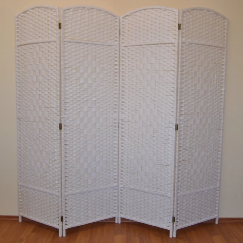 Čtyřdílný bílý paraván s dřevěnou konstrukcí a výpletem z mořské trávy zakryje prostor až 2 m. Skvěle se hodí do domácností, wellness i salonů. Výška 180 cm, šířka 4×50 cm, tloušťka 2,5 cm.