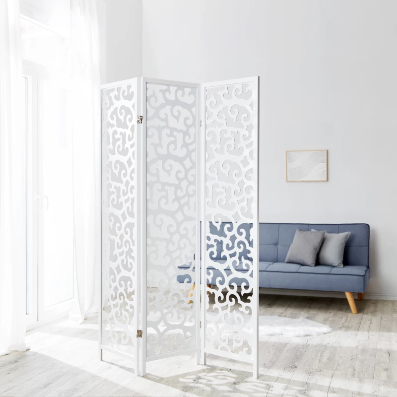 Skládací konstrukce umožňuje snadné přemístění i uskladnění. Dřevěný rám zajišťuje stabilitu a pevnost, zatímco dekorativní výřezy, ornamenty, frézované vzory dodávají paravánu jemný romantický, vintage nebo moderní nádech dle konkrétního designu. Bílá barva navíc opticky zvětšuje prostor a snadno se kombinuje s různými styly interiéru – od skandinávského až po provence.
