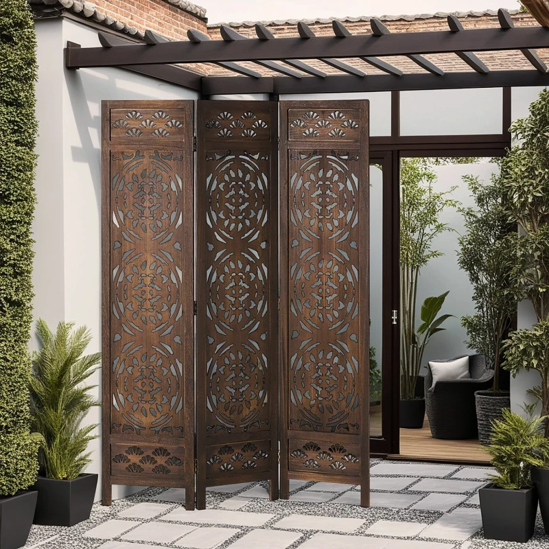 Tato dělící stěna z tmavého dřeva je víc než jen praktická příčka – je to stylový kus nábytku. Díky umělecky zpracovaným ornamentálním výřezům inspirovaným orientálním stylem přináší do vašeho domova eleganci, teplo a exotický nádech. Prolamovaný design umožňuje jemný průchod světla a vytváří útulnou a atmosférickou atmosféru v každé místnosti.