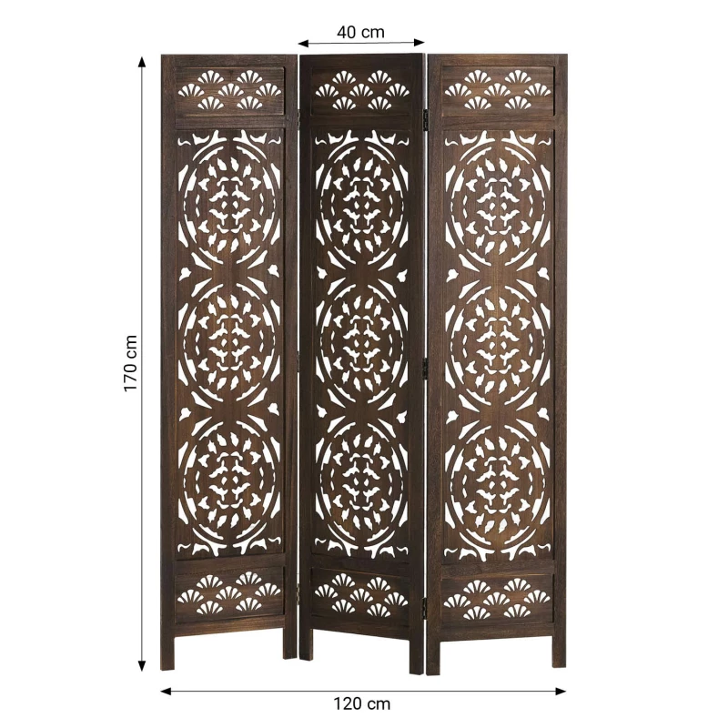 Tato dělící stěna z tmavého dřeva je víc než jen praktická příčka. Díky umělecky zpracovaným ornamentálním výřezům inspirovaným orientálním stylem přináší do vašeho domova eleganci, teplo a exotický nádech.