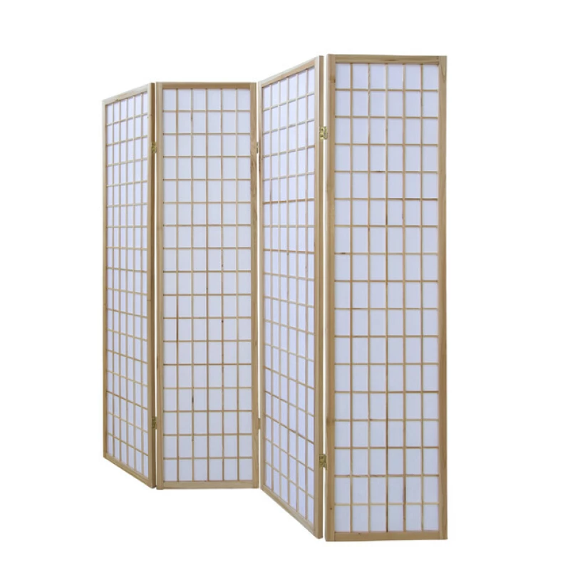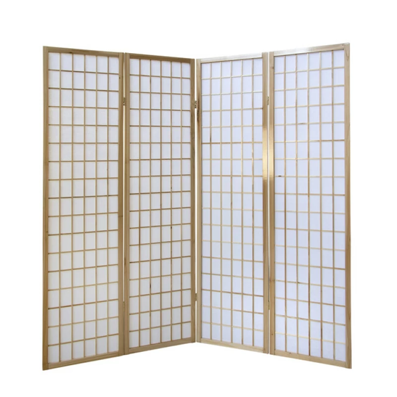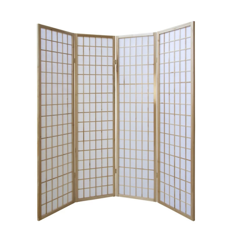 Čtyřdílný japonský paraván s natur rámem a rýžovým papírem nabízí elegantní řešení pro vytvoření soukromí a rozdělení prostoru. Hodí se do domácností, salonů, wellness i kaváren. Výška 175 cm, šířka 4×44 cm.