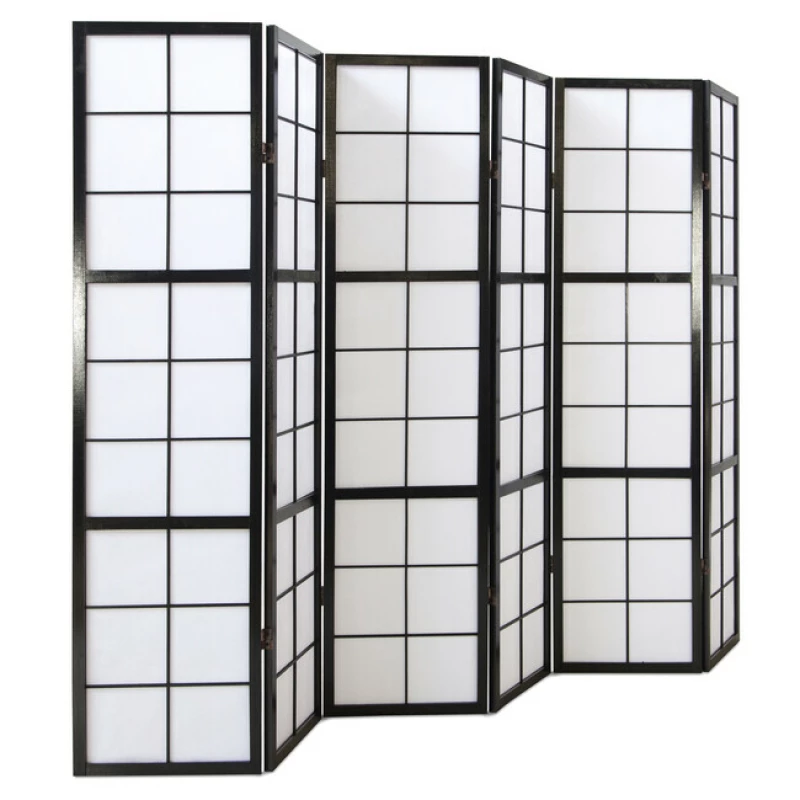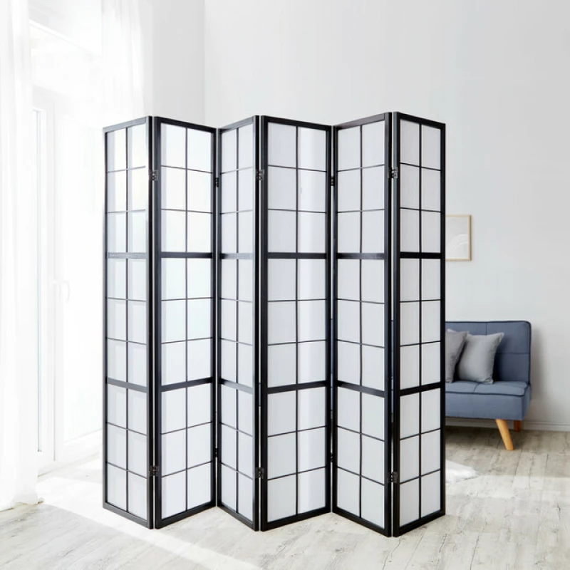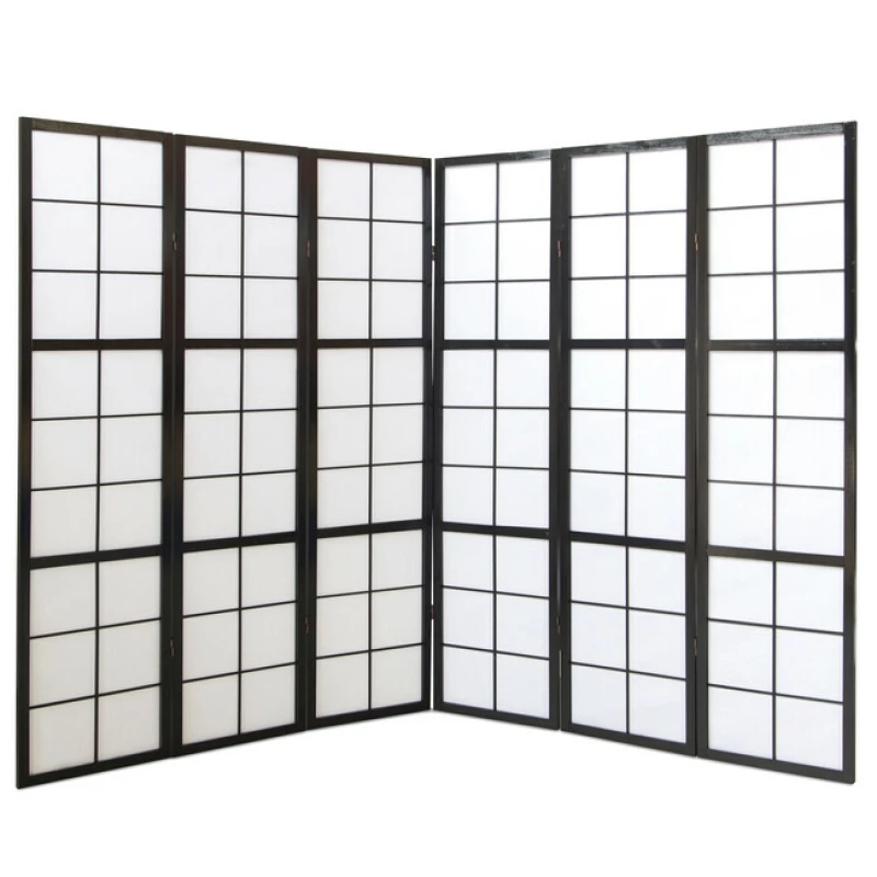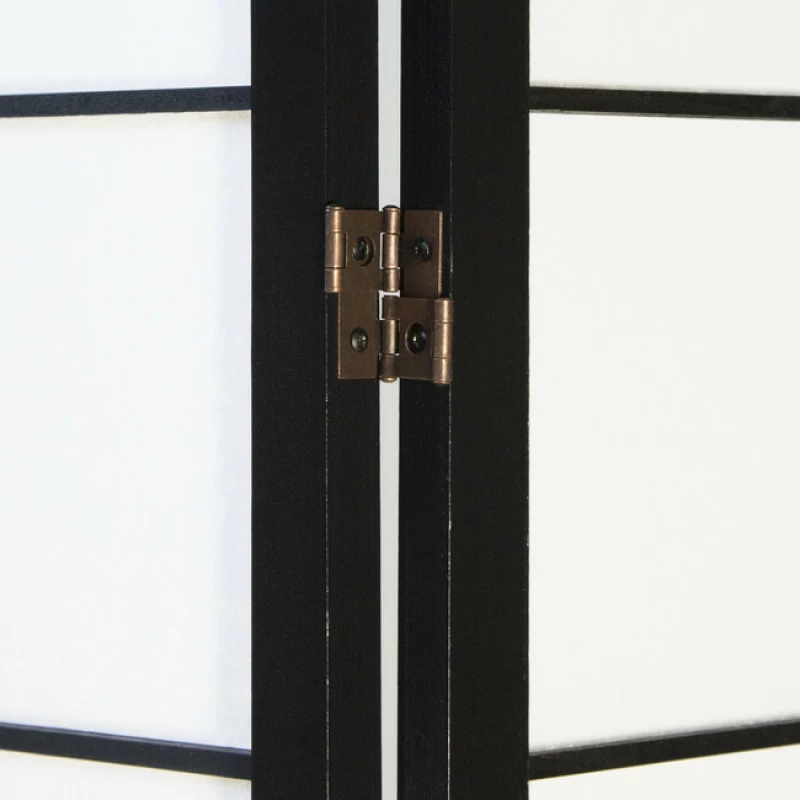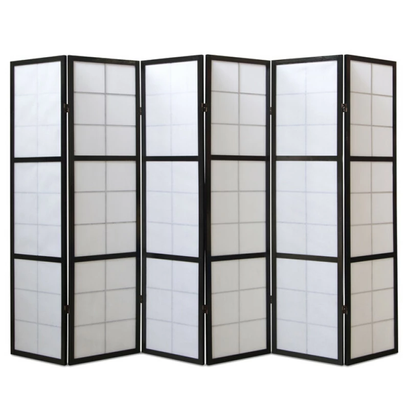 Šestidílný paraván s černým rámem a výplní z rýžového papíru. Praktická dělící stěna i elegantní dekorace interiéru. Vhodný do domácností, salonů, wellness i kaváren. Výška 175 cm, šířka 6×44 cm.