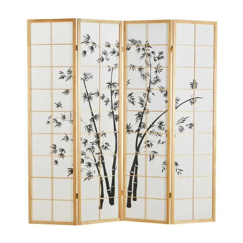 Japonský paraván s motivem černých bambusových větviček, přírodním rámem a rýžovým papírem. Stylová dělící stěna i dekorace interiéru. Vhodný do domácností, salonů i wellness. Výška 175 cm, šířka 4×44 cm.