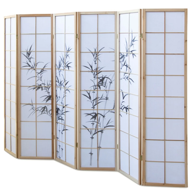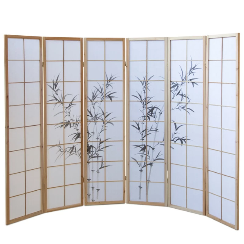 Šestidílný japonský paraván s motivem bambusu, přírodním rámem a rýžovým papírem. Praktická dělící stěna i dekorace interiéru. Vhodný do domácností, salonů, wellness i kaváren. Výška 175 cm, šířka 6×44 cm.