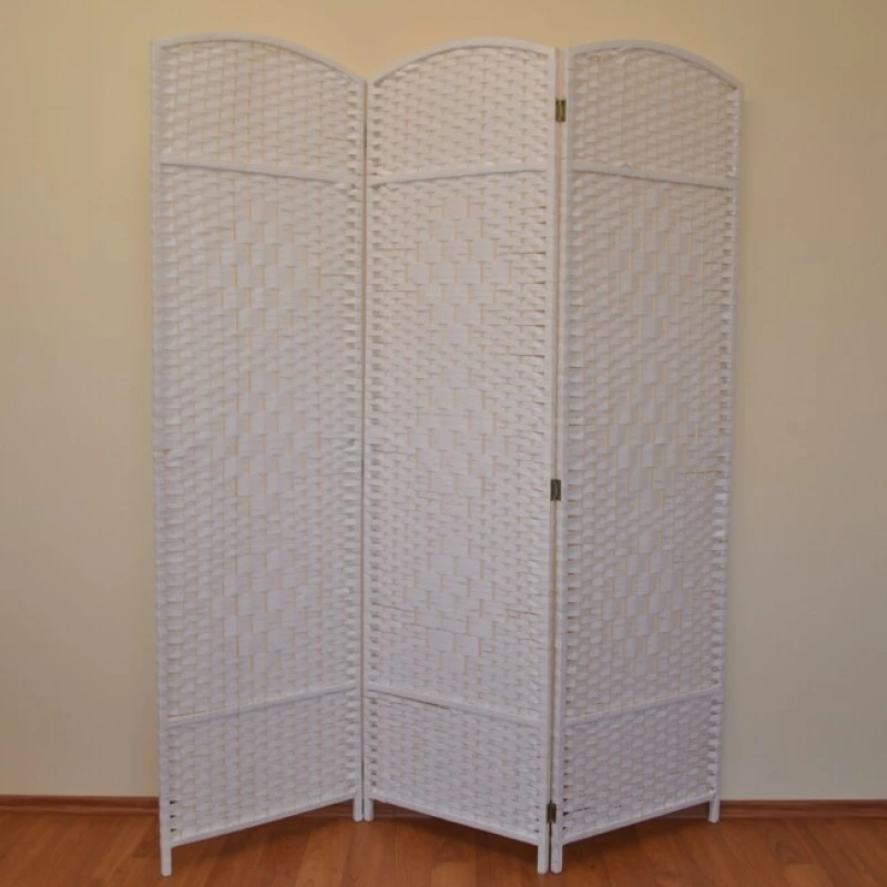 Třídílný bílý paraván s dřevěným rámem a výpletem z mořské trávy. Téměř neprůhledná dělící stěna vhodná do domácností, salonů i zdravotnických zařízení. Snadno se skládá a šetří místo. Výška 180 cm, šířka 3×50 cm.