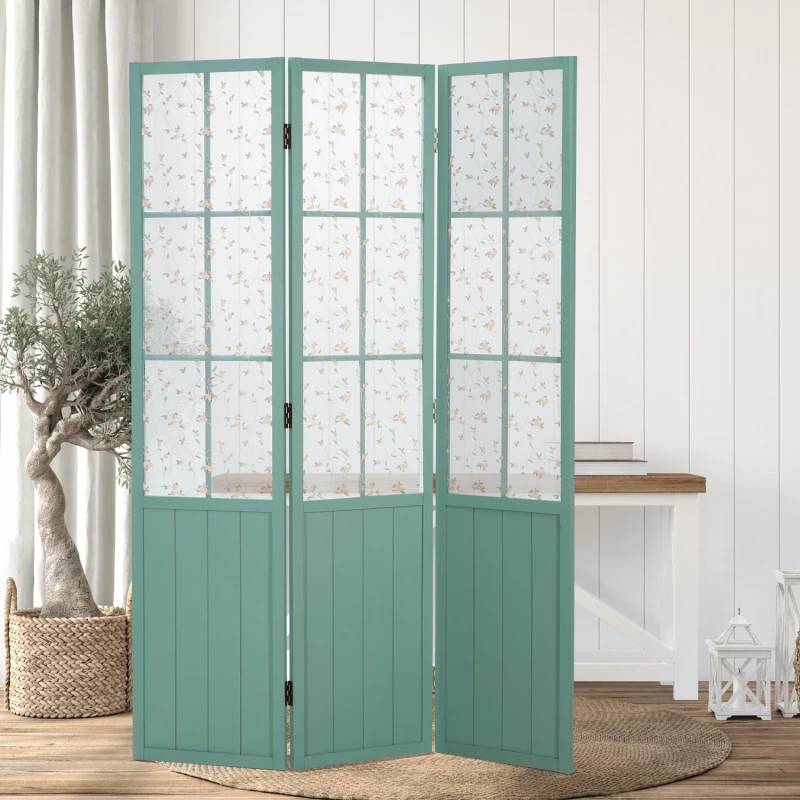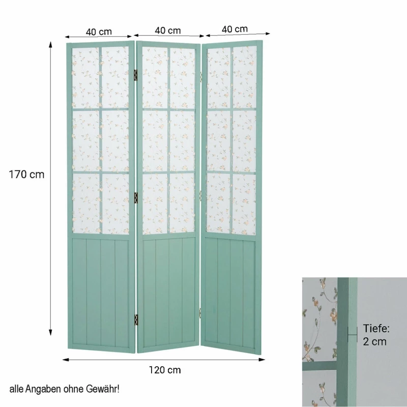 Tyrkysově zbarvená zástěna na ochranu soukromí vytváří díky svému idylickému vzhledu příjemnou atmosféru v každém obývacím pokoji. Horní část příčky s efektem okna je potažena látkou. Diskrétní květinový vzor na ní vytváří stylový poutač pozornosti. Dřevěné vzpěry ve spodní části dotváří venkovský styl zástěny.