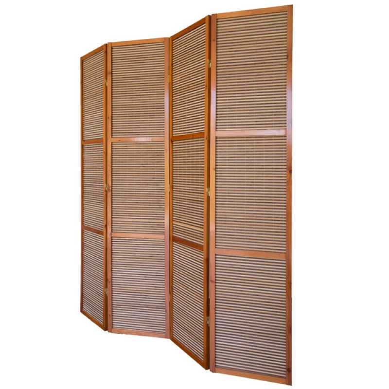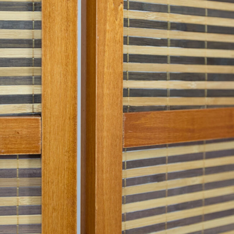 Vyšší čtyřdílný bambusový paraván s hnědým rámem a lamelovou výplní. Neprůhledná dělící stěna pro soukromí i design interiéru. Vhodný do domácností, salonů i wellness. Výška 200 cm, šířka 4×40 cm.