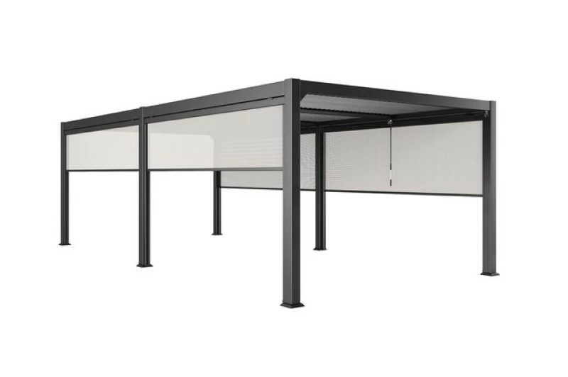 Čelní stínící roleta Deluxe na hliníkovou pergolu MARANZA 540 je prémiové řešení určené speciálně na čelní stěnu přístřešku. Tato luxusní screenová roleta poskytuje maximální ochranu před sluncem, větrem a zajišťuje dokonalé soukromí díky pokročilému kazetovému systému a kvalitním materiálům.