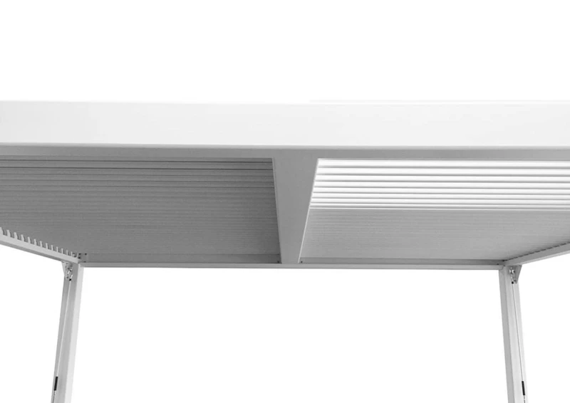 Klíčovým prvkem jedinečného designu zahradní pergoly jsou větrací střešní lamely. Jednoduchý manuální mechanismus umožňuje ovládat směr střešních lamel a vytvářet tak otevřený nebo uzavřený prostor. Geniální vestavěný drenážní systém znamená, že pokud se počasí změní, stačí zavřít lamelovou střechu, aby byla plocha naprosto odolná vůči povětrnostním vlivům. Dešťová voda stéká do okapových žlabů a odtéká přes nohy na zem.