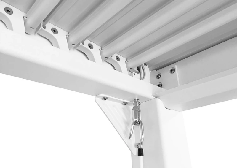 Pergola má šest sloupů připevňovaných k zemi speciálními kotvami s elegantními krytkami. Po úplném sklopení lamel se střecha stane nepropustnou. Voda je odváděna přes okapový systém a prostor zůstává suchý. Díky kvalitním materiálům není nutná žádná údržba. Spojovací materiál s návodem je součástí balení.