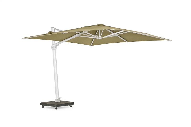 Luxusní terasový slunečník SUNS Palmoli 3×3 m v bílé barvě s prémiovou látkou Sunbrella®, 360° otočnou funkcí a robustní hliníkovou konstrukcí. Extrémně odolný, stálobarevný a ideální pro náročné venkovní podmínky.