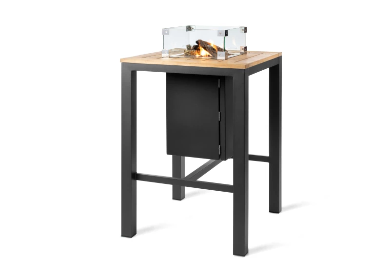 Tento barový stůl s hliníkovým rámem a teakovou deskou má elegantní, moderní vzhled, a proto se hodí do různých typů zahrad a teras. Stůl je vybaven vestavěným hořákem pro vytvoření atmosféry a tepla. Ideální k stání nebo posezení s vaší společností.