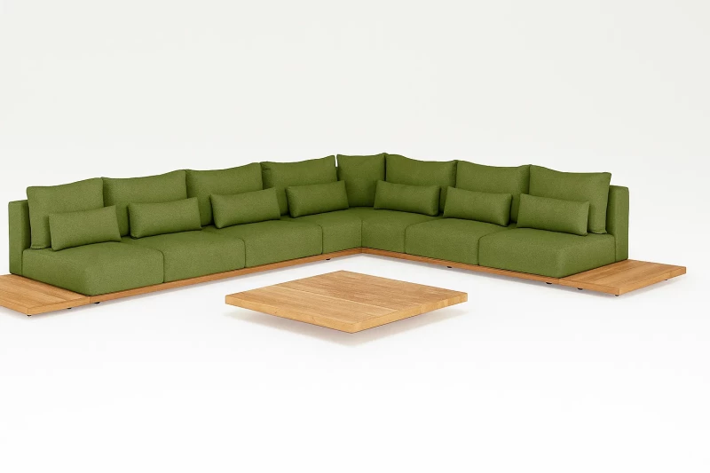 Nízké sezení a měkké polstry zajišťují ideální podmínky pro odpočinek. Pro rozšíření prostoru lze k sestavě přidat příruční stolky, boční lavice nebo lehátko, které z ASSPENU vytvoří dokonalou venkovní zónu pro relaxaci i společenské setkání.