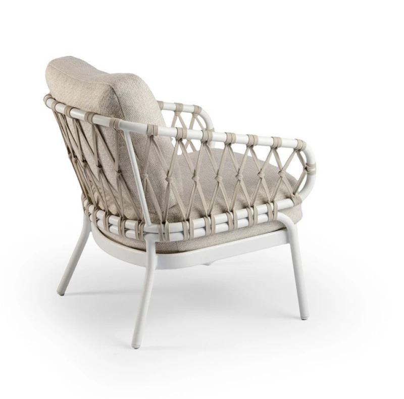 Nízká jídelní křesla Natal navazují na design stolu – jejich hliníková konstrukce je doplněna olefinovým lanem a polštáři z prémiové tkaniny Swiss Fabric, které zaručují maximální pohodlí a dlouhou životnost.
