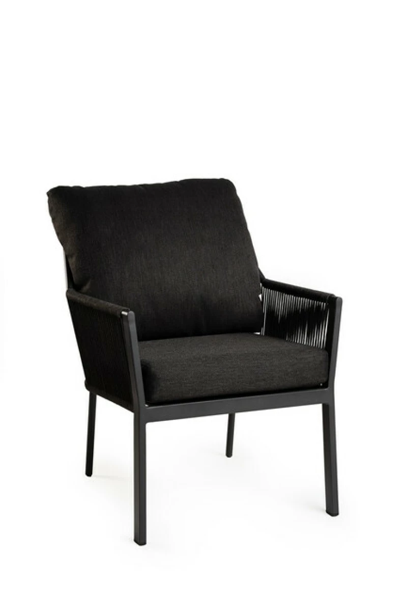 Elegantní nízká zahradní židle Tierra Outdoor Liv s hliníkovým rámem a provazovým výpletem v barvě charcoal. Stylová, pohodlná a odolná – ideální pro terasy, zahrady i lounge posezení.