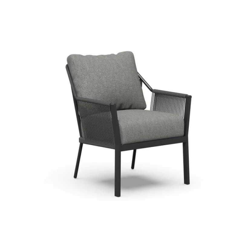 Elegantní nízká zahradní židle Tierra Outdoor Liv s hliníkovým rámem a provazovým výpletem v barvě charcoal. Stylová, pohodlná a odolná – ideální pro terasy, zahrady i lounge posezení.