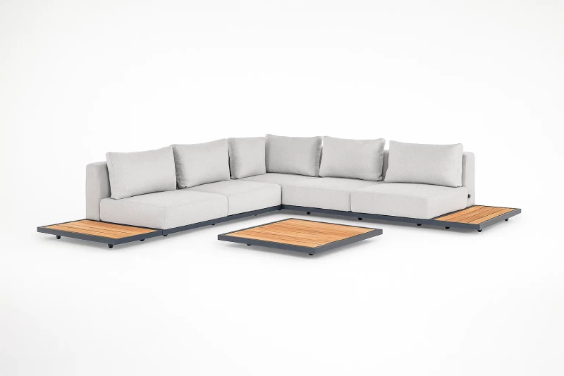 Luxusní terasová sestava SUNS KOTA spojuje hliník, teak a rychleschnoucí čalounění. Elegantní nízké sezení, modulární design a maximální komfort pro moderní venkovní relax.