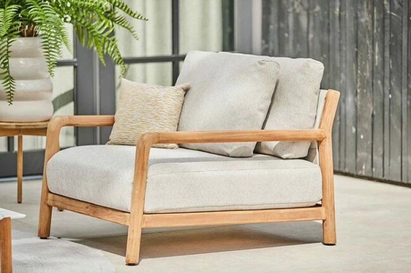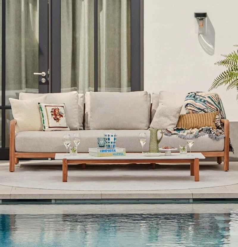 Sedací souprava SUNS Vittoria je navržena pro dlouhodobé používání venku – teakový rám, rychleschnoucí výplně a materiály Sunproof® a Neolith zaručují, že set odolá povětrnostním vlivům po celý rok.