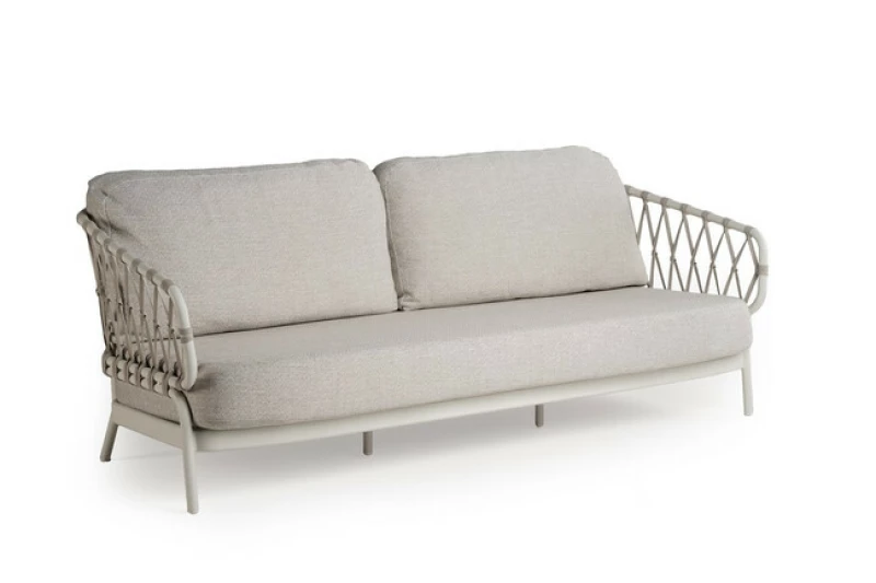 Luxusní třímístná zahradní pohovka Tierra Outdoor Natal (207,5×83,5×74 cm) v krémově bílé s holubími polštáři. Hliníkový rám odolný proti korozi, UV záření, snadná údržba. Elegantní design s pletenými detaily. Záruka 2 roky. Ideální pro terasu i zahradu.