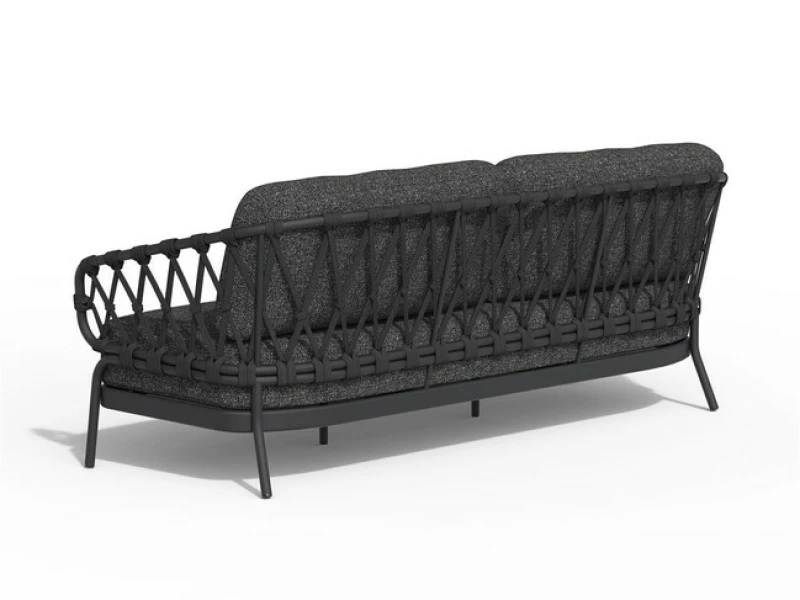 Elegantní design: Šedá povrchová úprava v kombinaci s luxusními kamenně šedými polštáři dodává moderní a vytříbený vzhled, který se snadno kombinuje s jakýmkoli stylem. Jemné pletené detaily z černého lana na opěradle vytvářejí vzdušnou estetiku s nádechem exkluzivity.