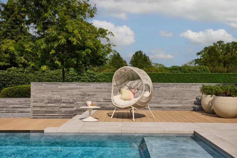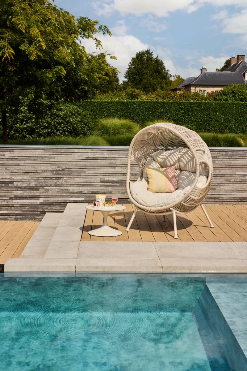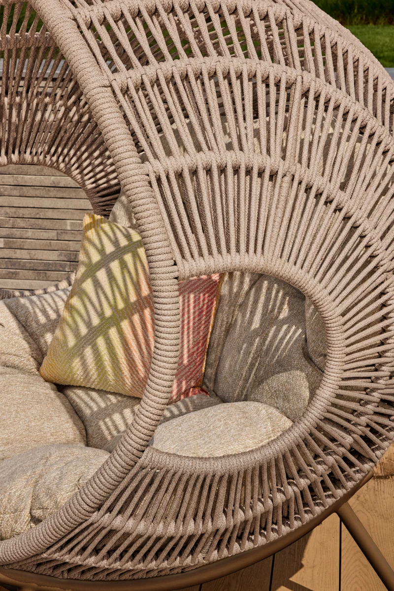 Stabilní podnož s lehce rozšířeným postavením zajišťuje pevnost i při velkorysých rozměrech křesla. Nuna Egg je solitérní prvek, který potřebuje prostor – na terase působí jako přirozené centrum relaxační zóny i jako estetický designový objekt.