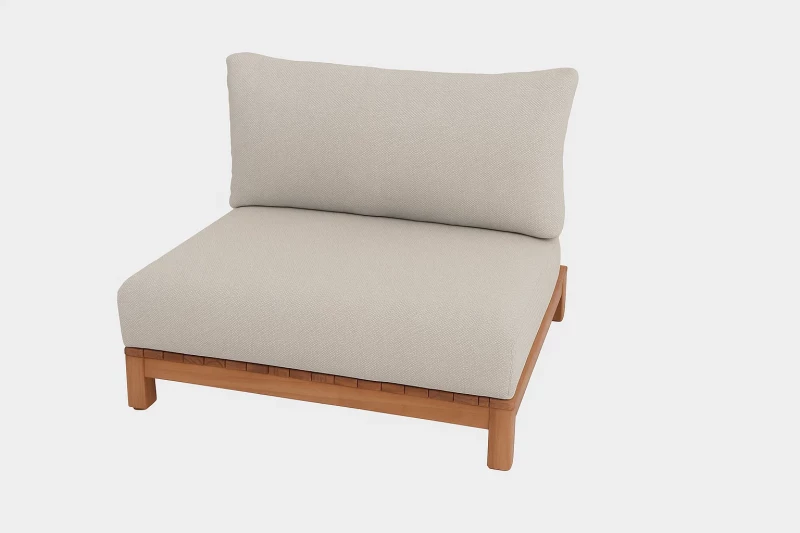 Luxusní středový díl SUNS Portofino Soft Grey (95×95×84 cm) s teakovou základnou a bohatým čalouněním. Quick Dry Foam rychleschnoucí pěna, prémiová látka Sunproof odolná UV a vlhkosti. Systém proti sklouzávání polštáře. Záruka 5 let, celoroční použití.