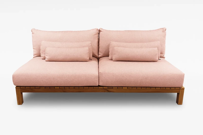 Luxusní 2-místná zahradní pohovka SUNS Portofino (214×107×86 cm) s teakovou základnou a hliníkovými opěradly. Fast Dry Foam polštáře s prémiovou látkou Sunproof®. Inovativní fixace polštářů, modulární systém. Dostupná v Soft Pink a Soft Grey.